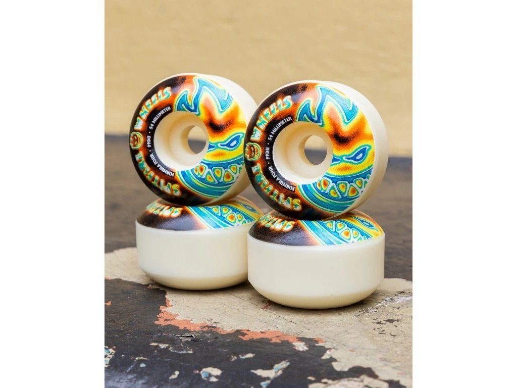 Vlajková zmes uretánu od značky SPITFIRE WHEELS nesie názov FORMULA FOUR a je považovaná za jednu z najlepších zmesí na skate kolieska na svete. Táto zmes zaručuje pomalšie opotrebenie koliesok, zabraňuje vzniku plošiniek a ako je u značky SPITFIRE zvykom zaručuje omnoho vyššiu rýchlosť. Kolieska s RADIAL tvarom sú kombináciou klasického a kónického tvarua a spájajú tak do seba tie najlepšie vlastnosti týchto 2 tvarov. Kolieska skvele držia na kopingu, tyčkách a múrikoch a rýchlosť, ktorá je u koliesok SPITFIRE FORMULA FOUR samozrejmosťou.