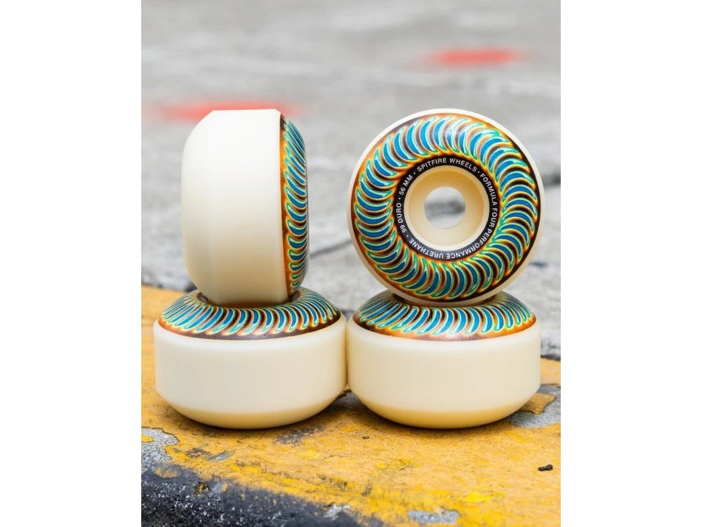 Vlajková zmes uretánu od značky SPITFIRE WHEELS nesie názov FORMULA FOUR a je považovaná za jednu z najlepších zmesí na skate kolieska na svete. Táto zmes zaručuje pomalšie opotrebenie koliesok, zabraňuje vzniku plošiniek a ako je u značky SPITFIRE zvykom zaručuje omnoho vyššiu rýchlosť. Kolieska s RADIAL tvarom sú kombináciou klasického a kónického tvarua a spájajú tak do seba tie najlepšie vlastnosti týchto 2 tvarov. Kolieska skvele držia na kopingu, tyčkách a múrikoch a rýchlosť, ktorá je u koliesok SPITFIRE FORMULA FOUR samozrejmosťou.