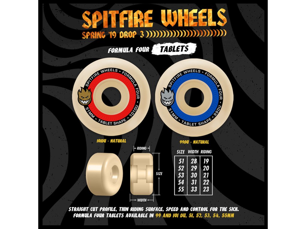 Vlajková zmes uretánu od značky SPITFIRE WHEELS nesie názov FORMULA FOUR a je považovaná za jednu z najlepších zmesí na skate kolieska na svete. Táto zmes zaručuje pomalšie opotrebenie koliesok, zabraňuje vzniku plošiniek a ako je u značky SPITFIRE zvykom zaručuje omnoho vyššiu rýchlosť. Kolieska s CLASSIC tvarom sa hodia na skateboarding v skateparku, bazéne ale aj na streete.