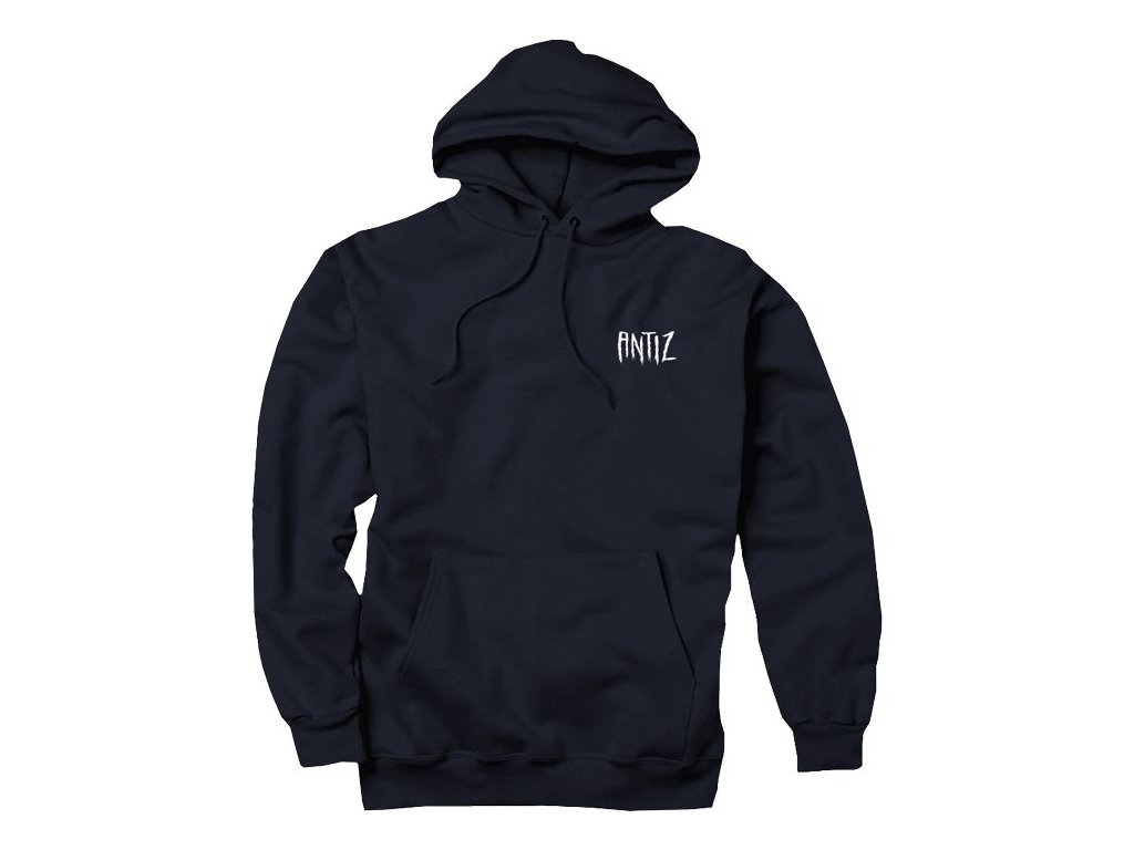 Klasická modrá mikina francúzskej skate značky ANTIZ s veľkou potlačou ikonickej sovy na chrbte a malého nápisu na ľavej časti hrudi.