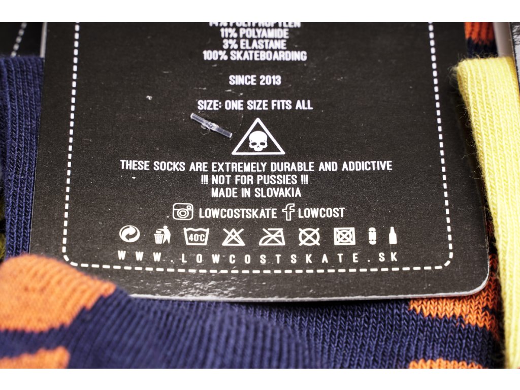 Naša kolaborácia s už legendárnymi skate ponožkami LOWCOST. Ak hľadáš ponožky, ktoré vydržia 7 dní nesmrdieť, sú vysoké a poholdné ako na skateboarding tak aj na bežný deň tak si ich práve našiel. Ponožky sú vyrábané na Slovensku.